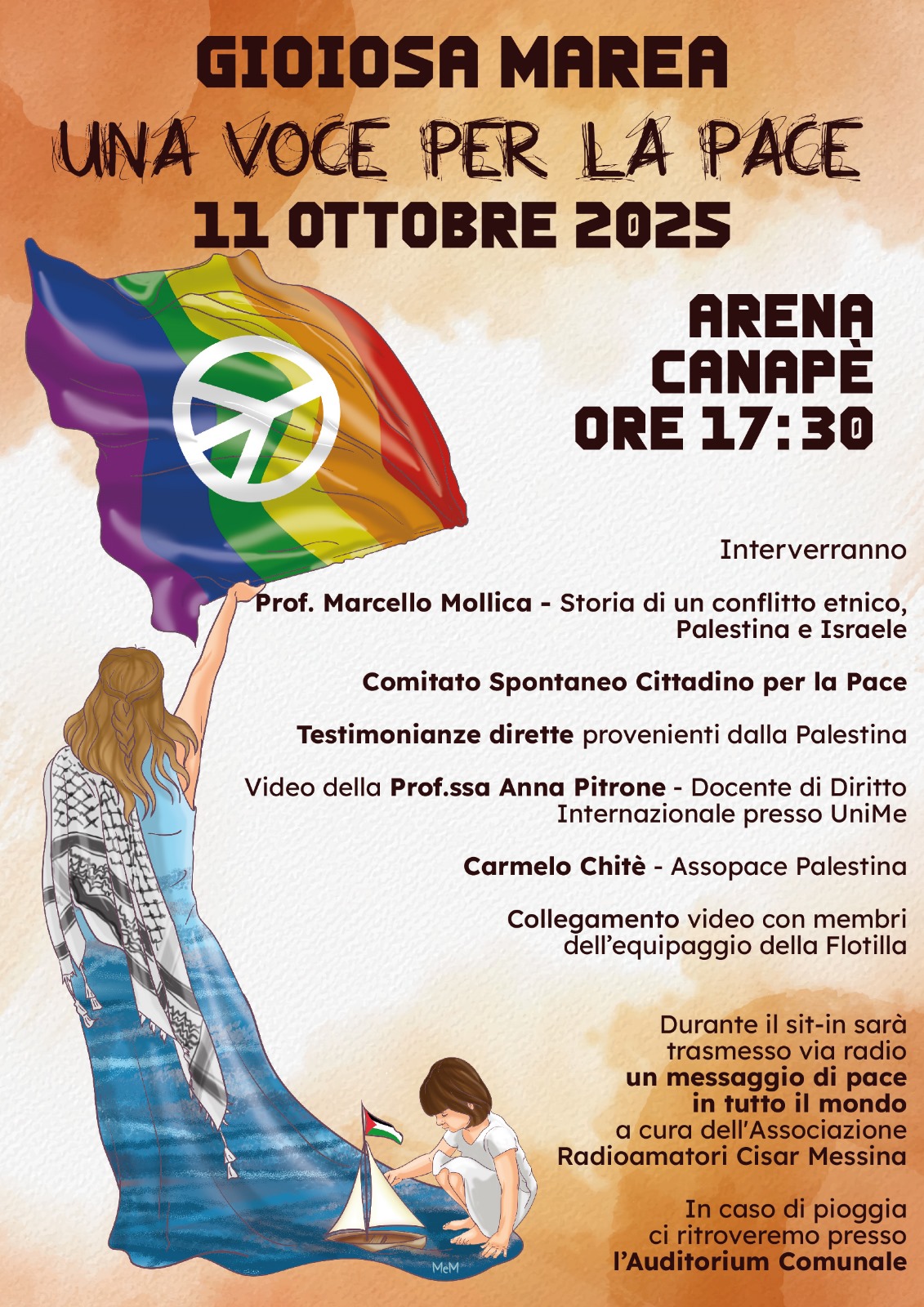 Il prossimo 11 ottobre, alle ore 17:30, presso l’Arena Canapè di Gioiosa Marea, si terrà l’iniziativa “Una voce per la pace”, un momento di riflessione, testimonianza e mobilitazione a sostegno del popolo palestinese e contro ogni forma di guerra e violenza.