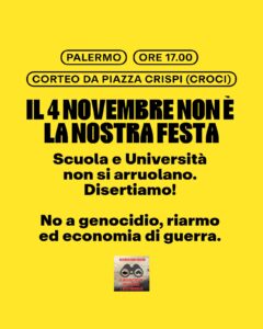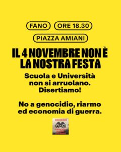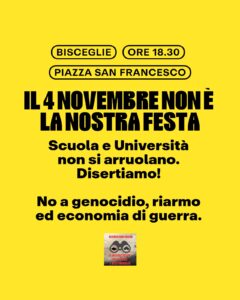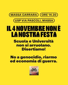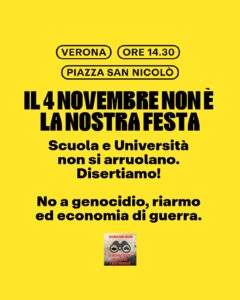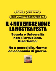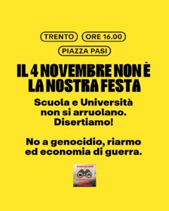 Come Osservatorio contro la militarizzazione delle scuole e delle università ci rifiutiamo di considerare il 4 novembre come una giornata di festa da celebrare, in quanto questa data rappresenta a nostro avviso piuttosto una giornata di lutto.
