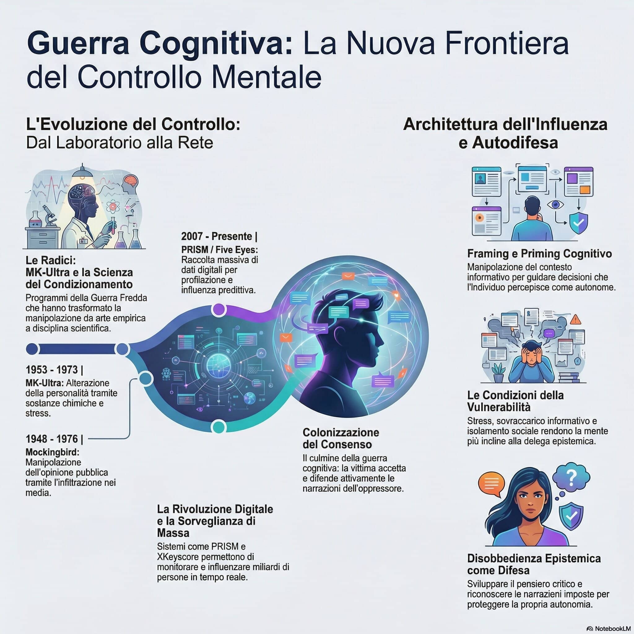 Questa infrastruttura tecnica si sposa con l’eredità dell’Operazione Mockingbird, che storicamente vide l’infiltrazione della CIA in oltre 400 testate giornalistiche per orientare l’opinione pubblica. Se Mockingbird forniva la narrativa, PRISM oggi fornisce il target. Come teorizzato da Chomsky nel suo Manufacturing Consent, il consenso non è più un atto spontaneo, ma un prodotto industriale calcolato su metadati che svelano le nostre paure più profonde, permettendo al potere di “guidare” la realtà percepita in tempo reale.